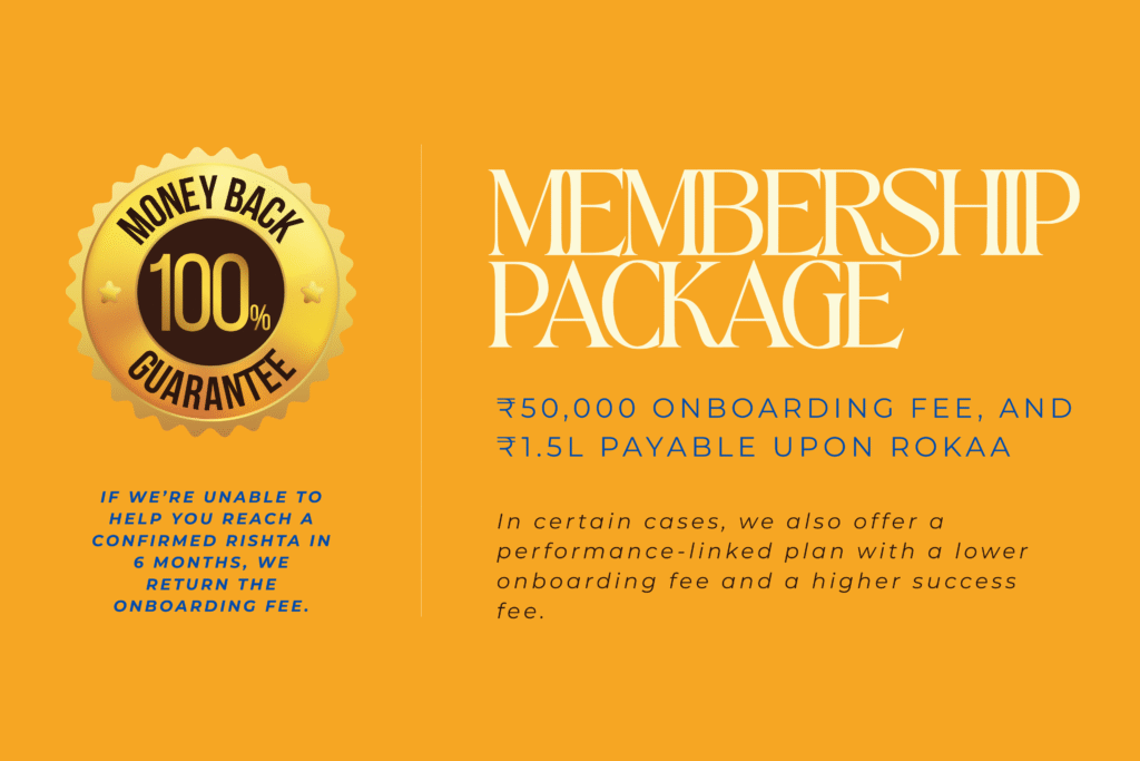 We work closely with you over a 6-month period. If we’re unable to help you reach a confirmed Rishta in that time, we return your onboarding fee.
